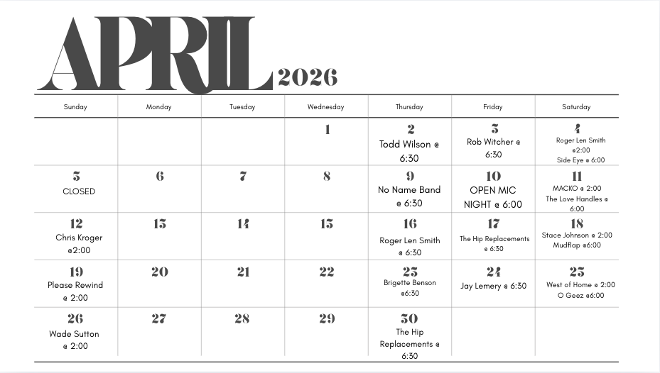 Sunday: Doors open at 11:00, Live Music starting at 2:00